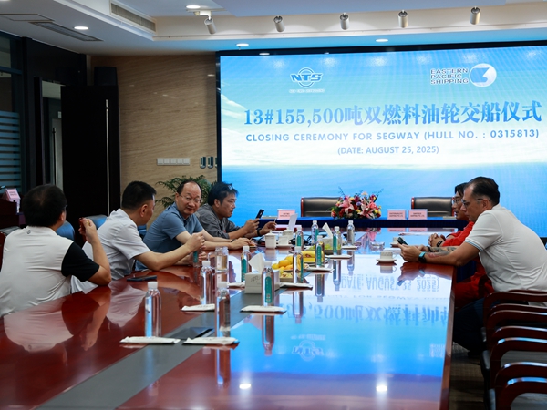 On August 25, 2025, the closing ceremony for 13# 155,500 DWT LNG Dual Fuel Crude Oil Tanker bearing Hull No.0315813 was held at the meeting room on 8th floor of New Times Office Building. The company's Chief Executive Officer Mr. Liu Haijin, Executive Deputy General Manager Mr. Zhang Yuyong and the owner's representatives Mr. Dino Vilicic and Mr. Ni Jie were present. The vessel was smoothly and successfully delivered by us and accepted by the Owner EPS.