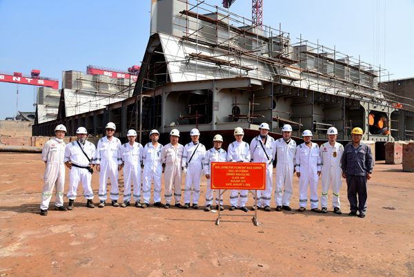 在鞭炮齊鳴中,33#34#210000噸雙燃料動力散貨船船體結構開始合攏搭載。該型210000噸雙燃料動力散貨船總長299.95米,兩柱間長294.75米、型寬50.00米,型深25.20米,設計吃水18.40米,結構吃水18.48米,載重噸210000MT。