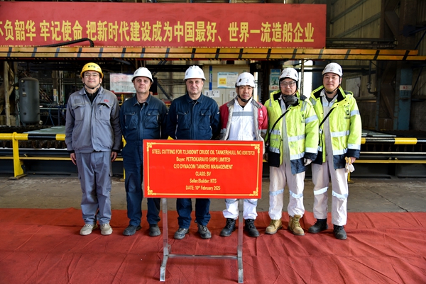 On February 10, 2025, the steel cutting of one 73,500 DWT Crude/Product Oil Tanker bearing builder's hull no.0307373 has been carried out successfully by New Times Shipbuilding Co., Ltd.. The representatives from shipyard, Dynacom Site Team and BV classification society attended and witnessed this event.