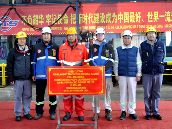 On February 29, 2024, the steel cutting of one 50,000 DWT Chemical/Product Oil Tanker bearing builder's hull no.0405054 has been carried out successfully by New Times Shipbuilding Co., Ltd. The representatives from EPS Site Office, ABS classification society and shipyard attended and witnessed the ceremony together.