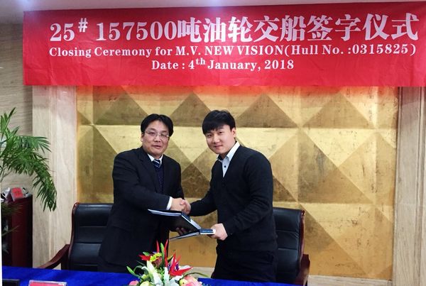 On January 4, 2018, the closing ceremony for No.25 157,500 DWT Crude Oil Tanker was held at the meeting room on 8th floor of New Times Office Building. Our Executive General Manger Mr. Zhang Yuyong and representatives from Owner Dong-A Tanker attended this ceremony. The delivery documents for this ship were successfully signed by both parties.