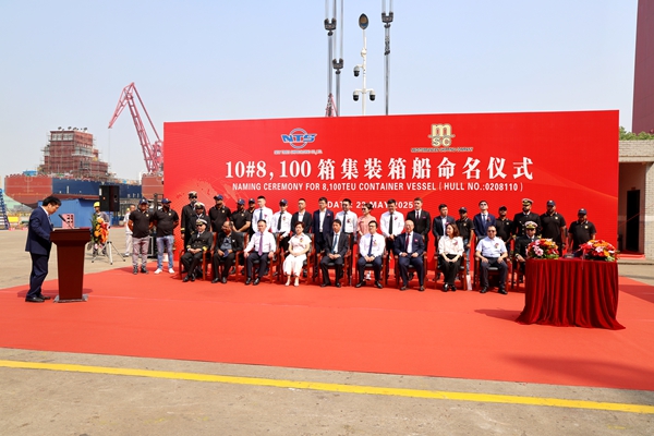 On 22 May, 2025, we held naming ceremony for one 8100 TEU Container Vessel with Builder's Hull No.0208110. Our Executive Deputy General Manager Mr. Zhang Yuyong, General Manager Assistant Mr. Xu Zhenyu, MSC site manager Mr. Chen Yukun, BV - Deputy Chief Executive Mr. Bill Chen, Marketing Manager Ms. Nancy Xia and other VIP guests attended this ceremony.