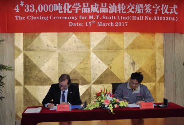 On March 15, the closing ceremony for No.4 33,000 DWT Product Oil and Chemical Tanker was held at the meeting room on 8th floor of New Times Office Building. The delivery documents for this ship were successfully signed by Executive General Manger Mr. Zhang Yuyong and representatives from the Contracted Buyer, Jo Invest AS.