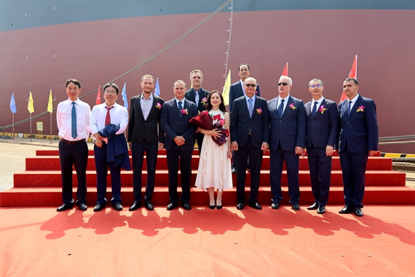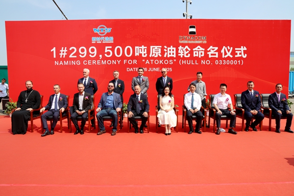 On 26 June, 2025, we held naming ceremony for one 299,500 DWT Crude Oil Tanker with Builder's Hull No.0330001. Our Executive Deputy General Manager Mr. Zhang Yuyong, General Manager Assistant Mr. Xu Zhenyu, Dynacom site manager Mr. Romeo Mustata, ABS site manager Mr. Cao Wei and other VIP guests attended this ceremony.