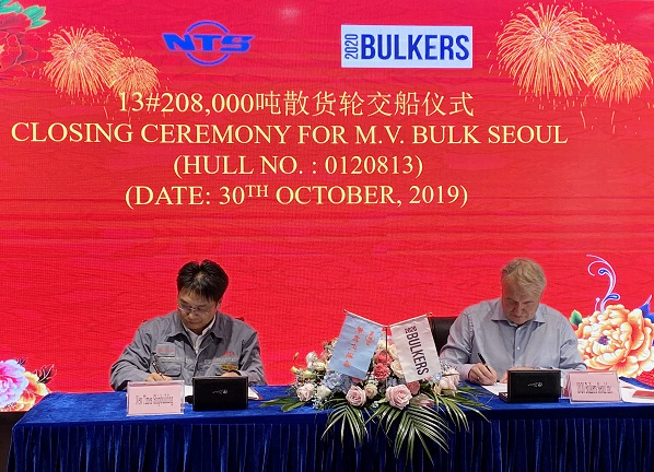 On October 30, 2019, the closing ceremony for 13# 208,000 DWT Bulk Carrier was held at the meeting room on 8th floor of New Times Office Building. Our Executive General Manger Mr. Zhang Yuyong and the representative from 2020 Bulkers Ltd. attended this ceremony. The vessel was smoothly and successfully delivered by us and accepted by the Buyer.