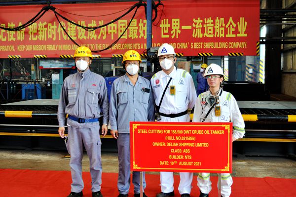 On August 10, 2021, the Steel Cutting of one 156,500 DWT Crude Oil Tanker bearing builder's hull no.0315855 has been carried out successfully by New Times Shipbuilding Co., Ltd.. Our Head of Production Department Mr. Chen Yuefeng and representatives from ABS classification society attended and witnessed this event.