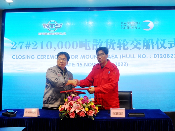 On November 15, 2022, the closing ceremony for 27# 210,000 DWT Bulk Carrier with Hull No.0120827 was held at the meeting room on 8th floor of New Times Office Building. Our CEO Mr. Liu Haijin, Executive Deputy General Manager Mr. Zhang Yuyong, Deputy General Manager & Executive Director Mr. Yuan Heng and owner's representative were present. The vessel was smoothly and successfully delivered by us and accepted by the Owner.