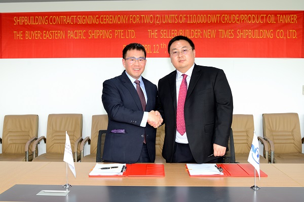 NEW TIMES SHIPBUILDING CO., LTD. has entered into two Shipbuilding Contracts with Singapore shipowner EPS (Eastern Pacific Shipping Pte. Ltd.) for building two(2)110,000DWT Crude/Product Oil Tankers recently.