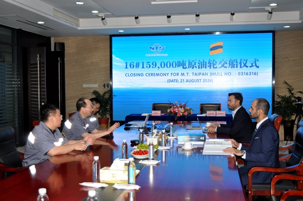On August 21, 2024, the closing ceremony for 16# 159,000 DWT Crude Oil Tanker bearing builder's hull no. 0316316 was held at the meeting room on 8th floor of New Times Office Building. Our CEO Mr. Liu Haijin, Executive General Manager Mr. Zhang Yuyong, Deputy General Manager & Executive Director Mr. Yuan Heng and owner's representative Mr. Evangelos Pelekanos  were present. The vessel was smoothly and successfully delivered by us and accepted by the Owner.