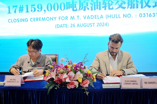 On August 26, 2024, the closing ceremony for 17# 159,000 DWT Crude Oil Tanker bearing builder's hull no. 0316317 was held at the meeting room on 8th floor of New Times Office Building. Our Executive General Manager Mr. Zhang Yuyong, Deputy General Manager & Executive Director Mr. Yuan Heng and owner's representative Mr. Evangelos Pelekanos  were present. The vessel was smoothly and successfully delivered by us and accepted by the Owner.