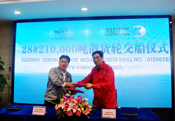 On November 3, 2022, the closing ceremony for 28# 210,000 DWT Bulk Carrier with Hull No.0120828 was held at the meeting room on 8th floor of New Times Office Building. Our CEO Mr. Liu Haijin, Executive Deputy General Manager Mr. Zhang Yuyong and owner's representative were present. The vessel was smoothly and successfully delivered by us and accepted by the Owner.