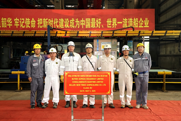On May 5, 2025, the steel cutting of 10# 11400 TEU Container Vessel bearing builder's hull no.0211410 has been carried out successfully by New Times Shipbuilding Co., Ltd. The representatives from the shipyard, the Owner CONGLOMERATE MARITIME LIMITED together with the representatives from BV classification society attended and witnessed this event.