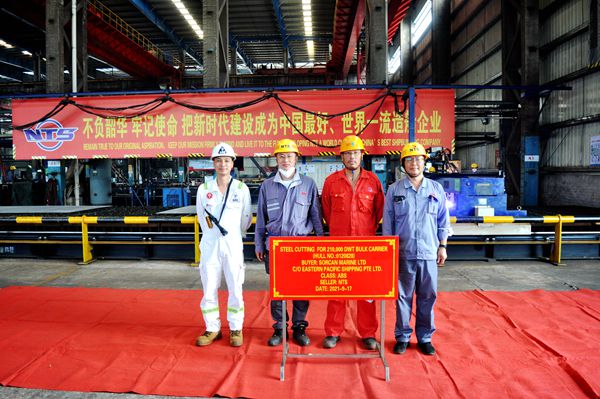On September 17, 2021,  the steel cutting of one 210,000 DWT Bulk Carrier bearing builder's hull no.0120828 has commenced. Our Head of Production Department Mr. Chen Yuefeng, QC Manager Mr. Qin Feng, representatives from EPS Site Manager Mr. Ni Jie together and representatives from ABS classification society attended and witnessed this event.