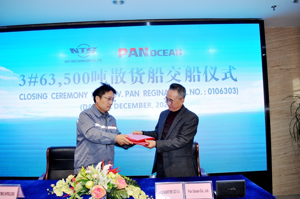 On December 22, 2020, the closing ceremony for 3# 63,500 DWT Bulk Carrier was held at the meeting room on 8th floor of New Times Office Building. Our CEO Mr.Liu Haijin, Executive General Manger Mr. Zhang Yuyong and the representive Mr. Nak Jin Choi from Pan Ocean Co., Ltd. attended this ceremony. The vessel was smoothly and successfully delivered by us and accepted by Pan Ocean.
