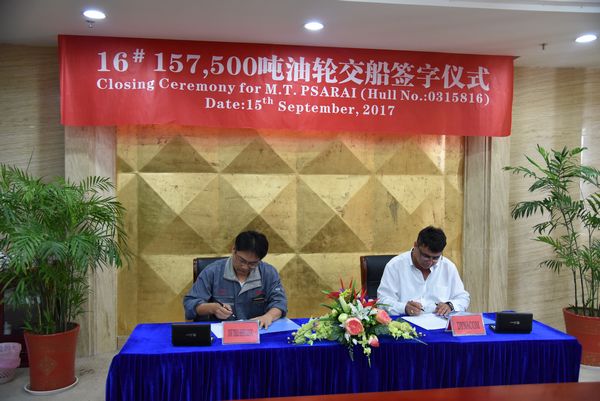 On September 15, the closing ceremony for No.16 157,500 DWT Crude Oil Tanker was held at the meeting room on 8th floor of New Times Office Building. Our Executive General Manger Mr. Zhang Yuyong and representatives from Owner Dynacom attended this ceremony. The delivery documents for this ship were successfully signed by both parties.