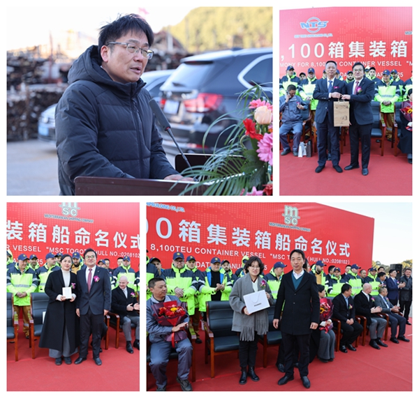 On 9 January, 2025, we held naming ceremony for two units of 8100 TEU Container Vessels with Builder's Hull Nos.0208102 and 0208108. Our Executive Deputy General Manager Mr. Zhang Yuyong, General Manager Assistant Mr. Xu Zhenyu, MSC site manager Mr. Chen Yukun, LR  site manager Mr. Kang Hong, BV New Construction Dept. Manager in China - Mr. Christophe Vaes and other VIP guests attended this ceremony.