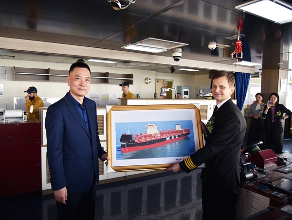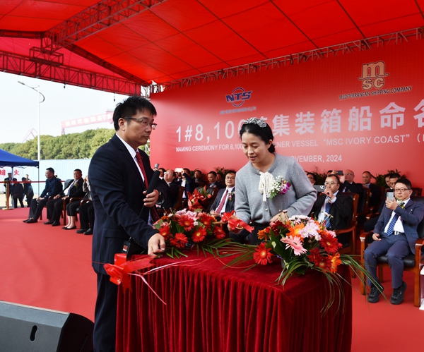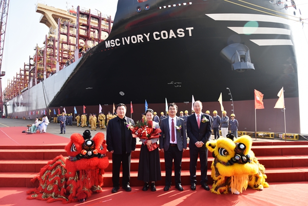 On 14 November, 2024, we held naming ceremony for one 8100 TEU Container Vessel with Builder's Hull No. 0208101. Our CEO Mr. Liu Haijin, Executive Deputy General Manager Mr. Zhang Yuyong, Deputy General Manager & Executive Director Mr. Yuan Heng, MSC China Area Manager Mr. CH Gargiulo, Senior Operation Manager of MSC Shanghai Company Ms. Ye Yun, MSC site manager Mr. Chen Yukun, LR Service Delivery Manager of China Mr. Shi Xintai and other VIP guests attended this ceremony. Godmother Ms Liu Jiao named the vessel for "MSC IVORY COAST".