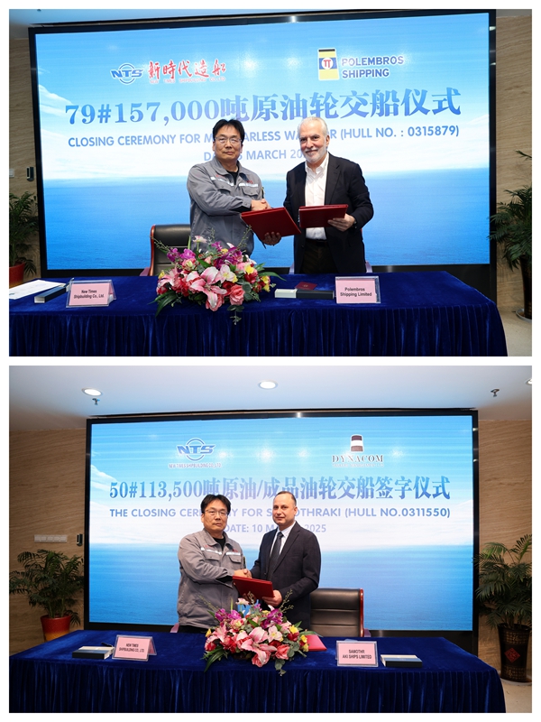 On March 5th and 10th, NTS successively signed the delivery documents with Greek shipowners Polembros Shipping Limited and Dynacom Tankers Management Ltd. The 79# 157,000 DWT Crude Oil Tanker and 50# 113,500 DWT Crude/Product Oil Tanker were smoothly and successfully delivered by us and accepted by the Owners.