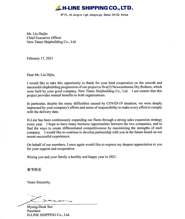 On February 10, 2021, the closing ceremony for 25# 208,000 DWT Bulk Carrier was held at the meeting room on 8th floor of New Times Office Building. Our CEO Mr.Liu Haijin, Executive General Manger Mr. Zhang Yuyong and the representive from H-Line Shipping Co., Ltd. Mr. Young Hwan Lee attended this ceremony. The vessel was smoothly and successfully delivered by us and accepted by H-Line, which also indicates that the five units of 208,000 DWT Bulk Carriers ordered by H-Line Shipping Co., Ltd. in our company has all been completed and delivered on schedule.
