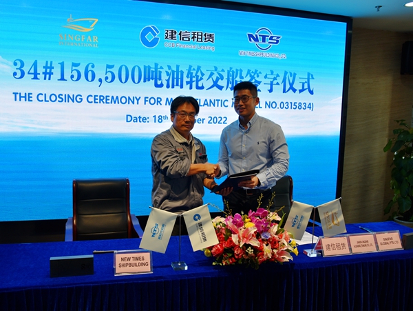 On October 18, 2022, e-closing for 34# 156,500 DWT Crude Oil Tanker was held at the meeting room on 8th floor of New Times Office Building. Our CEO Mr. Liu Haijin and Deputy General Manager & Executive Director Mr. Yuan Heng were present. Mr. Zhang Yuyong Executive Deputy General Manager of New Times Shipbuilding Co., Ltd., and Singfar representatives were present and the representative of CCB Financial Leasing Company Ms. Niu Wenjue signed the delivery documents via video and email. The vessel was smoothly and successfully delivered by us and accepted by the Buyer.
