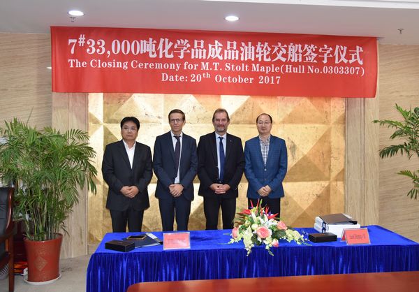 On October 20, the closing ceremony for No.7 33,000 DWT Product Oil and Chemical Tanker was held at the meeting room on 8th floor of New Times Office Building. Our CEO Mr. Liu Haijin, Executive General Manger Mr. Zhang Yuyong and representatives from Owner Frontline attended this ceremony. The delivery documents for this ship were successfully signed by both parties.