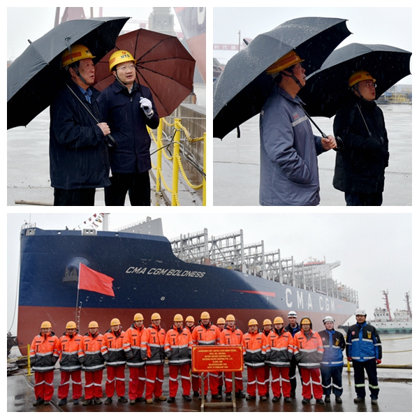 At 2:30 p.m., the launching ceremony of one 7000 TEU Container Vessel bearing builder's hull no.0207004 has been carried out successfully. Our Chairman Mr. Yuan Kaifei, Vice Chairman Mr. Zhu Bingkang, CEO Mr. Liu Haijin, Executive Deputy General Manager Mr. Zhang Yuyong, the representatives from EPS Site Office and ABS classification society attended and witnessed the ceremony together.