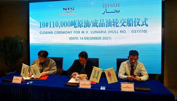 On 14 December, 2021, the closing ceremony for 10# 110,000 DWT Crude/Product Oil Tanker with Hull No.0311110 was held at the meeting room on 8th floor of New Times Office Building. Our CEO Mr. Liu Haijin, Executive Deputy General Manager Mr. Zhang Yuyong and owner's representative were present, and the members from owner's head office also witnessed this ceremony through video. The vessel was smoothly and successfully delivered by us and accepted by the Owner.