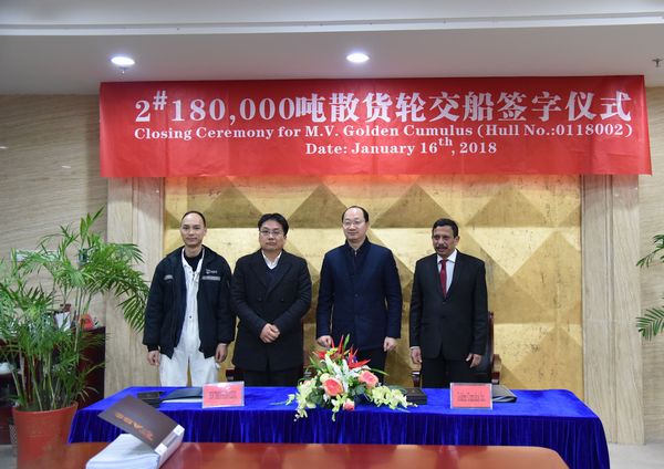 On January 16, 2018, the closing ceremony for No.2 180,000 DWT Bulk Carrier was held at the meeting room on 8th floor of New Times Office Building. Our CEO Mr. Liu Haijin, Executive General Manger Mr. Zhang Yuyong and representatives from Owner Frontline attended this ceremony. The delivery documents for this ship were successfully signed by both parties.
