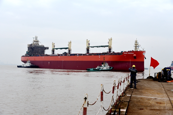 On October 4, No.3 63,500 DWT Bulk Carrier launched successfully from NTS Drydock. Our CEO Mr.Liu Haijin, Executive General Manger Mr. Zhang Yuyong, Deputy General Manager Mr. Zhu Hangang,  Assistant General Manager Mr. Xu Zhenyu, Assistant General Manager Mr. Dujiang and the representatives from the Owner Pan Ocean Co., Ltd. and Class ABS attended and witnessed the ceremony together.