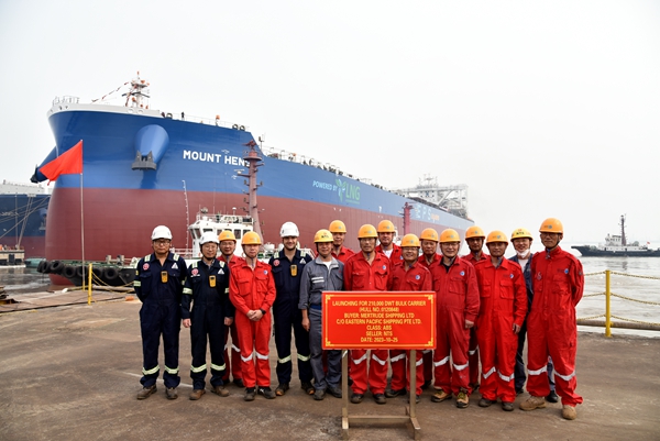 On October 25, 2023, the launching ceremony of one 210,000 DWT Bulk Carrier bearing builder's hull no.0120848 has been carried out successfully by New Times Shipbuilding Co., Ltd. Our Chairman Mr. Yuan Kaifei, CEO Mr. Liu Haijin, Executive Deputy General Manager Mr. Zhang Yuyong, Deputy General Manager & Executive Director Mr. Yuan Heng, the representatives from EPS Site Office and ABS classification society attended and witnessed the ceremony together.