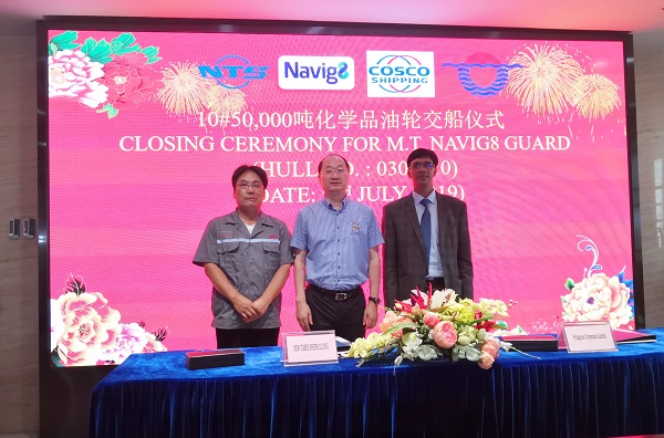 On July 5, 2019, the closing ceremony for 10# 50,000 DWT Product Oil/ Chemical Tanker was held at the meeting room on 8th floor of New Times Office Building. Our Executive General Manger Mr. Zhang Yuyong and the representatives from Navig8 Mr.Binod Kumar attended this ceremony. The vessel was smoothly and successfully delivered by us and accepted by the Buyer.