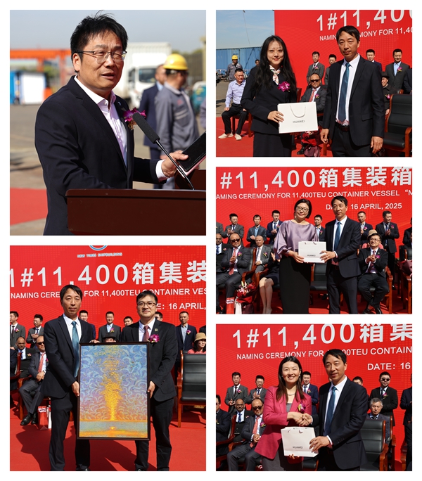 On 16 April, 2025, we held naming ceremony for two units of 8,100 TEU Container Vessels with Builder's Hull Nos.0208103 and 0208109 together with one unit of 11,400 TEU Container Vessel with Builder's Hull No.0211401. Our Executive Deputy General Manager Mr. Zhang Yuyong, General Manager Assistant Mr. Xu Zhenyu, MSC site manager Mr. Chen Yukun, BV Marine&Offshore China, New Construction Manager Mr. Christophe Vaes,ABS China Central Area General Manager Mr. Song Aimin, LR Deputy PM Mr. Liu Yi and other VIP guests attended this ceremony.