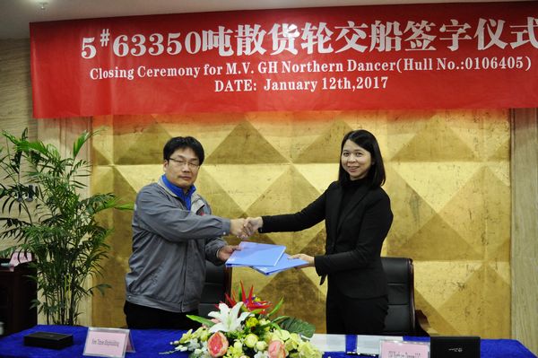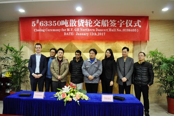 On January 12, 2017, the closing ceremony for No.5 64,000 DWT Bulk Carrier was held at the meeting room on 8th floor of New Times Office Building, and relevant delivery documents were signed by Executive Deputy General Manger Mr. Zhang Yuyong and representatives from the Contracted Buyer, Celsius.