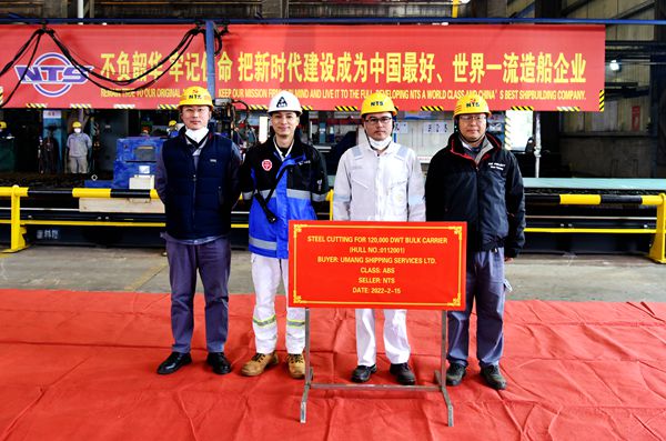 On February 15, 2022, the steel cutting of one unit of 120,000 DWT Bulk Carrier bearing builder's hull no. 0112001 has commenced. Our Head of Production Department Mr. Chen Yuefeng, QC Manager Mr. Qin Feng, representatives from MITTAL site office Mr. Li Jun and representatives from ABS classification society attended and witnessed this event.