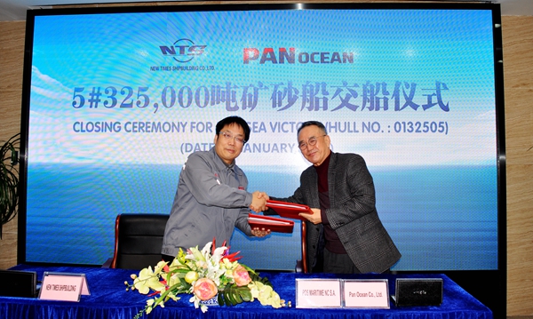 On January 12, 2021, the closing ceremony for 5# 325,000 DWT Ore Carrier was held at the meeting room on 8th floor of New Times Office Building. Our Executive General Manger Mr. Zhang Yuyong, the representive from Pan Ocean Mr. Nak Jin Choi attended this ceremony. The vessel was smoothly and successfully delivered by us and accepted by Pan Ocean.