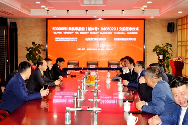 On February 7, at morning time around 9:28, the closing ceremony for 29# 50,000 DWT Product Oil/Chemical Tanker (IMO II Type) was held at the meeting room on 8th floor of New Times Office Building. Our CEO Mr. Liu Haijin, Executive Deputy General Manager Mr. Zhang Yuyong, Deputy General Manager & Executive Director Mr. Yuan Heng, Executive Director from Business Department of CDB Leasing (International) Co., Ltd. Mr. Xiong Jianfeng and Vice General Manager Mr. Xu Tao of Shandong Shipping Corporation attended this ceremony. The vessel was smoothly and successfully delivered by us and accepted by the Owner.