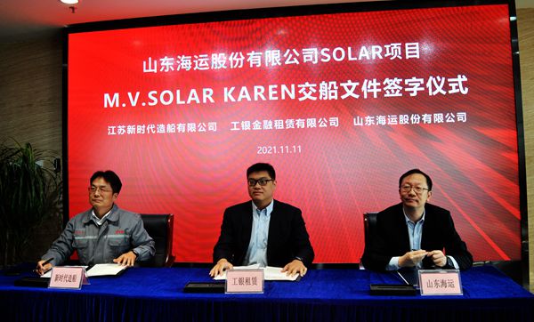 劉海金在儀式上致辭,他首先對(duì)百忙之中前來參加儀式的各位領(lǐng)導(dǎo)、各位來賓表示最熱烈的歡迎! 2019年6月,通過克拉克森公司牽線,我們與殼牌公司成功簽署了8艘5萬噸Ⅱ類化學(xué)品船的意向書,在山東海運(yùn)和工銀租賃的參與支持下,一起開啟了合作之旅:2020年4月27日首制船開工,2020年12月18日首制船下水,2021年4月23日兩艘首制船同時(shí)交付,今天,我們?cè)俅蜗嗑,共同見證該項(xiàng)目的收官之作。回顧這一年半的日日夜夜,562個(gè)辛勤奮斗的日子里,精誠(chéng)配合、一起努力,用優(yōu)質(zhì)高效的實(shí)際行動(dòng)和八艘高品質(zhì)的船舶產(chǎn)品,展現(xiàn)了彼此間的務(wù)實(shí)合作。我代表新時(shí)代公司向全體員工表示感謝,向殼牌公司、山東海運(yùn)、工銀租賃、挪威船級(jí)社、中國(guó)船級(jí)社、克拉克森、船隊(duì)管理公司、船東現(xiàn)場(chǎng)監(jiān)造團(tuán)隊(duì)表示衷心的感謝和崇高的敬意!雖是彼此間的首度合作,但卻在世界海運(yùn)界泛起了陣陣漣漪:以船舶融資租賃的創(chuàng)新模式構(gòu)筑起各方互利共贏、協(xié)同發(fā)展的緊密關(guān)系,締造了豐富的高質(zhì)量發(fā)展成果,凝聚起彼此深厚的互信和友誼。