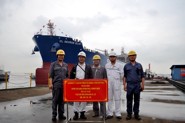 下午5:20,34#50000噸Ⅱ類化學品船駛出船塢,該船東是國銀金租,系列船長183.23米,型寬32.2米,型深19.1米,設計吃水11米,結構吃水13.3米,載重噸49200噸(結構吃水下),航速14.2節(jié),配置主機型號為MAN B&W 6G50ME-C9.6 Tier III (SCR)。