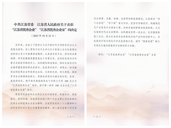 公司喜獲“江蘇省優(yōu)秀企業(yè)”殊榮受表彰