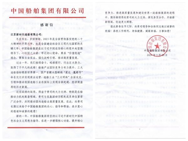 正如感謝信中所述,新的一年,我們與中國(guó)船舶集團(tuán)在共同推動(dòng)國(guó)內(nèi)造船業(yè)高質(zhì)量發(fā)展的進(jìn)程中,將繼續(xù)深化務(wù)實(shí)合作、開(kāi)拓嶄新領(lǐng)域、創(chuàng)造更大輝煌!