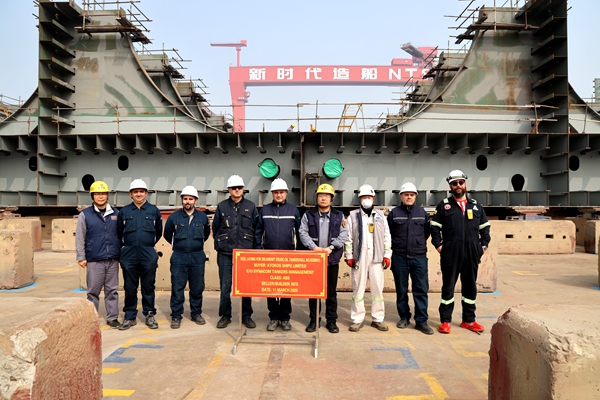 3月11日上午,公司在西區(qū)2#塢內(nèi)舉行船舶進(jìn)塢合攏儀式,1#295000噸油船船體結(jié)構(gòu)開始合攏組裝,常務(wù)副總經(jīng)理張玉永與希臘船東Dynacom代表等出席活動(dòng)。