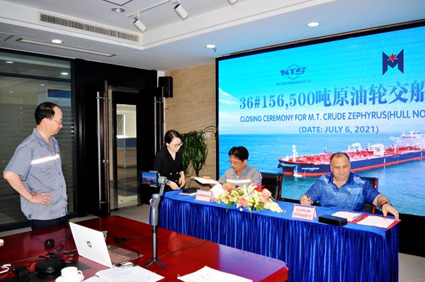 在大家的見證下,常務(wù)副總經(jīng)理張玉永與希臘船東METROSTAR MANAGEMENT CORP.代表共同簽署交船文本,名為“CRUDE  ZEPHYRUS”的36#156500噸油船正式交付船東,這是本月交付的第二艘船舶。