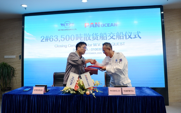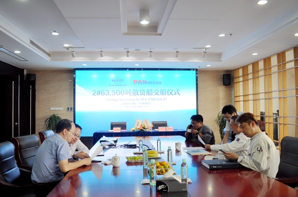 韓國船東Pan Ocean Co., Ltd.在我們企業(yè)共訂制了3艘63500噸散貨船,今天交的是該系列船舶的第二艘。