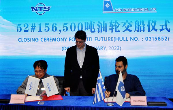 10日上午9:00,常務(wù)副總經(jīng)理張玉永與建信金融租賃公司執(zhí)行總經(jīng)理尹海波先生、銷售總監(jiān)鈕文玨女士共同簽署33#156500噸油船交船文件;下午3:00,張玉永又與希臘船東AVIN INTERNATIONAL LTD代表簽署了52#156500噸油船的交船文本,兩船正式交付船東運(yùn)營(yíng)。