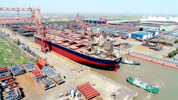 同天下午1:00,公司新區(qū)船塢,船舶下水工作正式啟動,在海事拖輪的牽引下,6#、18#208000噸散貨船相繼駛出船塢,順利實現(xiàn)大節(jié)點目標。