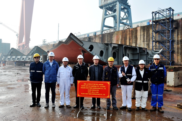 副總經(jīng)理朱韓剛與山東海運(yùn)代表以及中國(guó)船級(jí)社和DNV-GL船級(jí)社代表等嘉賓共同到現(xiàn)場(chǎng),點(diǎn)燃鞭炮,噴灑香檳,祝愿船舶建造過(guò)程安全且快捷。