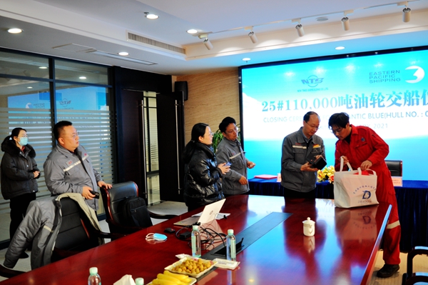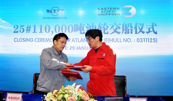 總經(jīng)理劉海金、常務(wù)副總經(jīng)理張玉永、董事袁衡與船東新加坡Eastern Pacific Shipping Pte. Ltd.(EPS)公司代表一起出席活動,見證船舶成功交付。25#110000噸油船的成功交付使企業(yè)新年首月實現(xiàn)完工交付船舶5艘,交船總量突破百萬載重噸,達(dá)到了106萬載重噸。