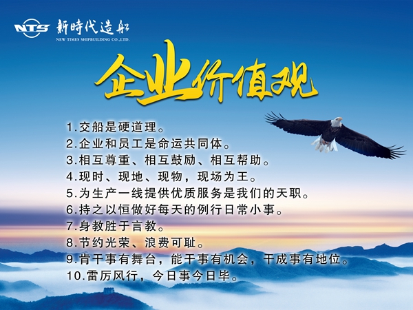 文化創(chuàng)新是引領(lǐng)企業(yè)各類創(chuàng)新的重要前提,公司將企業(yè)的歷史、現(xiàn)狀及經(jīng)營(yíng)戰(zhàn)略等告之廣大員工,發(fā)動(dòng)大家進(jìn)行討論,提出建議和意見(jiàn),再提交到經(jīng)營(yíng)層進(jìn)行審核,設(shè)計(jì)確定出符合企業(yè)發(fā)展需要的企業(yè)精神、目標(biāo)、愿景、使命與價(jià)值觀。多年來(lái),我們新時(shí)代造船將“誠(chéng)信敬業(yè)、追求卓越”作為企業(yè)精神,就是全體干部職工忠于事業(yè)、忠于職守、立足本職崗位、無(wú)私奉獻(xiàn)的精神境界,更是全體干部職工積極探索、勇于創(chuàng)新、敢為人先、力爭(zhēng)上游、斗志昂揚(yáng)、意氣風(fēng)發(fā)助推企業(yè)經(jīng)濟(jì)快速發(fā)展精神風(fēng)貌的綜合體現(xiàn)。