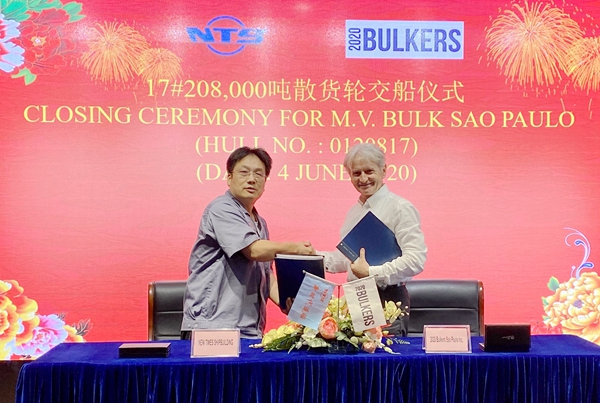 6月4日下午,17#208000噸散貨船交船簽字儀式在公司辦公樓八樓會(huì)議室舉行,公司常務(wù)副總經(jīng)理張玉永與挪威船東2020 Bulkers公司代表Davor Radic先生一起出席儀式,共同簽署交船文本。
