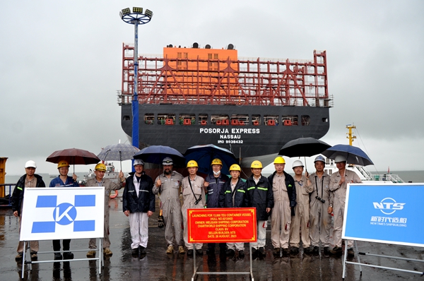 下午2:00,總經(jīng)理劉海金與希臘船東Chartworld公司代表來到公司2#塢區(qū)域,觀看船舶下水。隨著塢門緩緩打開,船舶下水工作正式啟動(dòng),2#13000箱集裝箱船在多艘拖輪的配合牽引下離開船塢,駛向東區(qū)舾裝碼頭,進(jìn)行后續(xù)的舾裝、設(shè)備調(diào)試等工作。2#13000箱集裝箱船總長335米,兩柱間長325米,型寬51米,型深27.3米,設(shè)計(jì)吃水13米,結(jié)構(gòu)吃水16米,空高(基準(zhǔn)線以上)小于65米,載重噸139,550噸(結(jié)構(gòu)吃水下)。希臘船東Chartworld公司目前在我們企業(yè)訂制了兩艘13000箱集裝箱船,今天下水是第2艘船舶。